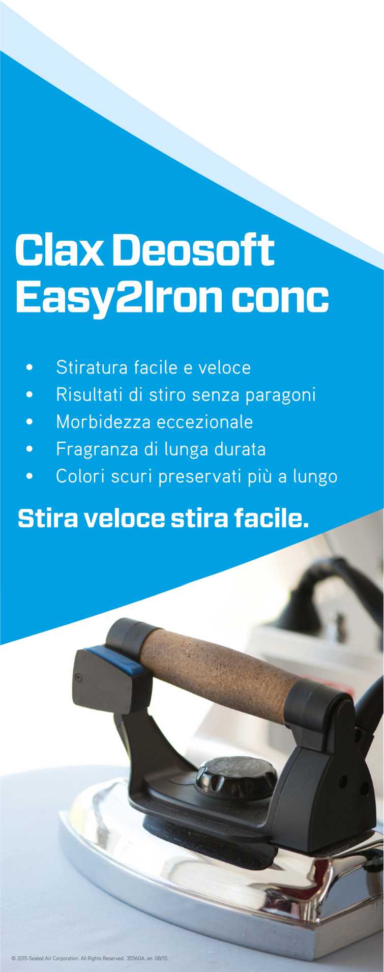 Clax Deosoft Easy2Iron conc contiene materie prime speciali in grado di ridurre le pieghe e di facilitare lo stiro sia a mano sia con mangani e calandre. Il prodotto è stato formulato con un profumo moderno di lunga durata, che conferisce ai tessuti una piacevole fragranza. Clax Deosoft Easy2Iron conc utilizza la tecnologia O.N.T. (Odor Neutralazing Technology) per l'eliminazione dei cattivi odori; grazie a questa tecnologia agisce contro i cattivi odori, inattivandoli. Inoltre, protegge i tessuti scuri dallo scolorimento, conferendo ai capi un aspetto rinnovato e brillante più a lungo.